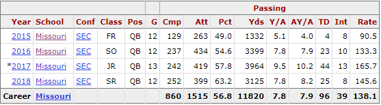 Drew Lock is going into the 2019 NFL draft touted as the top QB prospect in the nation. This says more about the QB class than his own ability though, as watching him does not give you the feeling he is the top guy. Lock does not have the same electricity that engulfed the Deshaun Watsons and Baker Mayfields of the world. He does not exude that IT factor that made Chicago jumps up at grab Mitchell Trubisky. He is for the most part, a rather generic gunslinger. He shows promise, and as much as others fall in love with his cannon for an arm, I believe his true selling point is his pocket presence. Pocket presence is not something that can be taught easily, and to have that radar already means he will not have to worry too much about learning to feel the rush coming. QBs who can throw the deep ball are a dime a dozen, but that skill in the pocket is what is really great about Lock. What is talked little in detail is also his mobility. While Lock will not outrun any defenders, he is not a sitting duck either. He a good amount of speed, and a resolve in throwing on the run that allows him to break from the pocket and sling the ball to the next open receiver when needed. He is a sideline-scrambler, meaning when he does scramble, he tends to head toward the sideline looking for a pass downfield rather than taking off with the ball. If no receiver is open, he has the head to get rid of it. This decision making is where Lock’s game begins to find its cracks though. Lock’s decision making and game management are inconsistent to his game’s level. He can throw the ball deep, he is accurate on the run, and he is smart enough to know when throwing the ball away is better than taking the sack. When he actually follows through is another matter entirely. Lock has a classic gunslinger mentality; He looks for the open man and will not hesitate to chuck the ball at the slightest hint of a playmaking opportunity. This has caused him to throw the deep ball on the run into double coverage when the smarter option would have been to hold it and pick up a handful of yards, or toss the ball out of bounds. This inconsistency and “live in the moment” attitude has burned Lock and Missouri in a few games. On top of this, Lock is simply not that good when faced with legitimate competition. Take a look at his statline from the 4 games against ranked opponents posted above and what do you see? Lock severely under-performs against hard competition. He threw abysmal-to-subpar in all the games minus Florida, and only had 1 TD against ranked opponents until the Florida game. If he cannot perform even to an adequate level against tough college competition, it makes his prospects against professional competition at the NFL level even harder to imagine in a positive light. The future does look bright for Lock though because of this fact; His biggest flaw is something that can be coached, and his decision making can improve with experience and maturity. I would not classify Lock as a draft breaking talent, and even the idea of taking him in the 1st round feels like a stretch to me unless the team is in absolute dire need of a QB.