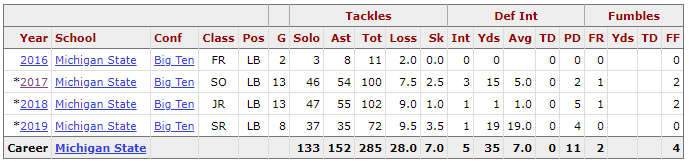 Excellent productivity with two 100 tackle seasons, and on pace to crack 100 again in ‘19