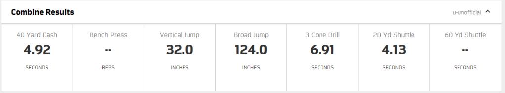 Fairly reasonable level of power with above average Broadjump, but weak vertical